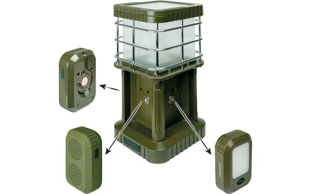 Diese Schwaiger Campingleuchte ist derperfekte Begleiter bei jedem Ausflug, egal ob in die Wildnis oder an den Campingplatz. Die Leuchte besteht aus einer Haupteinheit sowie 3 abnehmbaren Zusatzelementen (2x Leuchte + 1x BluetoothÂź Lautsprecher). Die Stromversorgungder Haupteinheit ĂŒbernimmt ein 5.000 mAh groĂer Lithium Akku, welcher via Magnetkontakten zusĂ€tzlich die montierten Elemente und deren Akkus lĂ€dt.