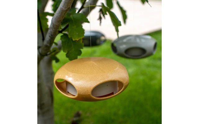 Birds go outer space, ist eine neue Generation der VogelfutterhĂ€uschen. Ein moderner Flugkörper, bei dessen Entwicklung auf eine ornithologisch korrekte FĂŒtterung geachtet wurde. Das Futtersilo im Herzen des Raumschiffs verhindert, dass seine Passagiere auf dem Essen herumhĂŒpfen und es verunreinigen. Wir wĂŒnschen guten Flug!