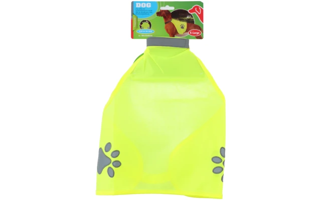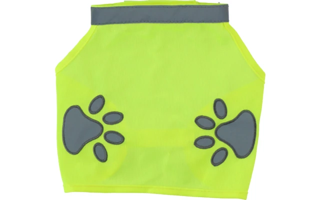 Reflektierende Weste fĂŒr Hunde in neongrĂŒner Signalfarbe und mit Reflexmaterial. Die Weste wird ĂŒber den RĂŒcken gelegt und mit KlettbĂ€ndern um die Brust und um den Hals befestigt.
