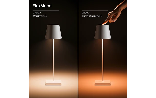 Stimmungsvoll: Das FlexMood-Feature bietet ĂŒber den Touch-Dimmer warmweiĂes und blendfreies Licht in zwei Farbtemperaturen (2.700 K und 2.200 K). So verbreitet sie jederzeit die passende LichtatmosphĂ€re – auch als Nachttisch- oder Leselampe.