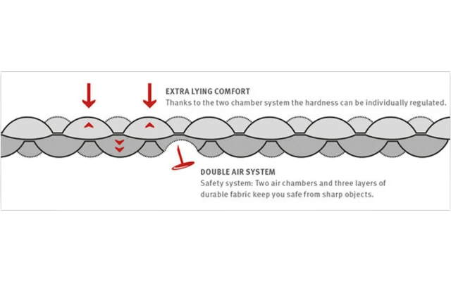 Das doppelte Luftkammersystem der COREO-Luftmatratze bietet Xtra- Komfort und Xtra-Schutz. Im Falle eines Lecks bleibt eine Luftkammer als Sicherheitsreserve erhalten. Die Luftmatratze COREO besteht aus einer punktgeschweiĂten Konstruktion aus ineinander verbundenen Kammern. Die Luftverteilung passt sich der Körperform an und sorgt fur eine ausgeglichene Liegeposition. Der HĂ€rtegrad der Matratze kann individuell reguliert werden, z.B. hĂ€rter auf der Unterseite und weicher auf der Oberseite. Die vielen kleinen Luftpolster gleichen auch gröĂere Bodenunebenheiten aus und bieten, dank der Mattenhöhe von 7,5 cm und einer Mattenbreite von 62 cm, einen hohen Schlafkomfort. Auf dem Rucken schlafenden Personen bietet sie genugend LiegeflĂ€che, um die Arme an den Seiten bequem abzulegen. Das Ober- und Unterseitenmaterial besteht aus einem robusten 40D Rip Stop Nylon mit einer TPU Beschichtung. Die Luftmatratze ist mit drei Kombinationsventilen ausgestattet, die ein Einlass- und ein Ablassventil enthalten. Ein Ventil befindet sich auf der Oberseite und eines auf der Unterseite der Matte. Das Kissen hat ein separates Kombiventil. Zu guter Letzt dient der Packsack auch als Pumpsack. Mit dieser cleveren Funktion ist die COREO Luftmatratze unschlagbar einfach im Gebrauch.